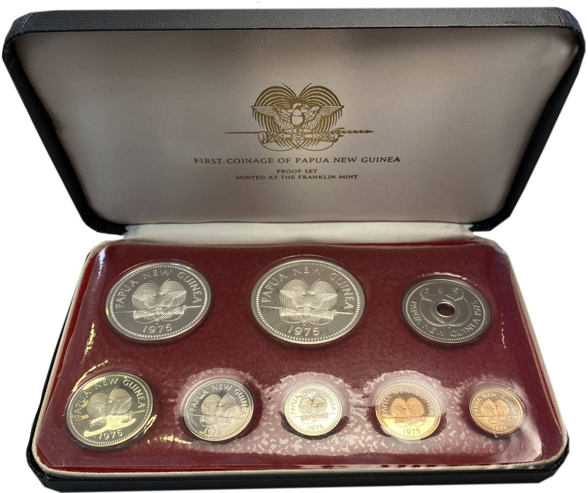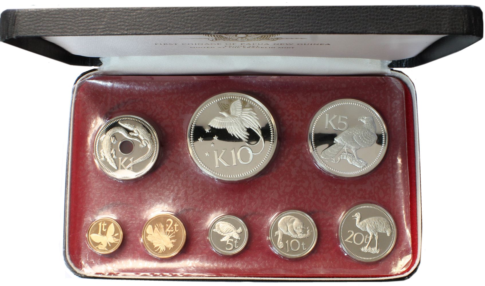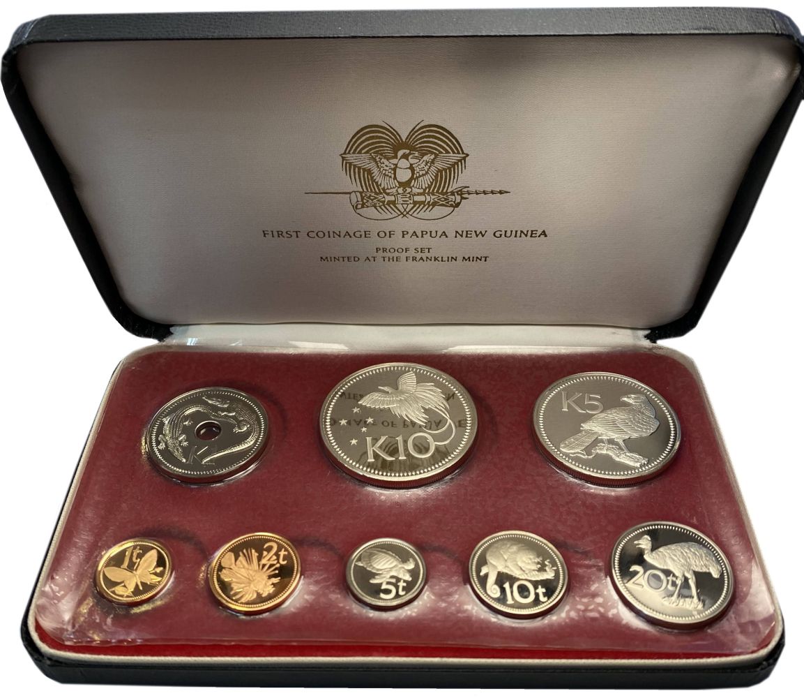 Zestaw zawiera 8 monet: 10 Kina (Ag925, 41,6 g), 5 Kina (Ag500, 27,6 g), 1 Kina (CuNi), 20 Toea (CuNi), 10 Toea (CuNi), 5 Toea (CuNi), 2 Toea (Brąz), 1 Toea (Brąz)